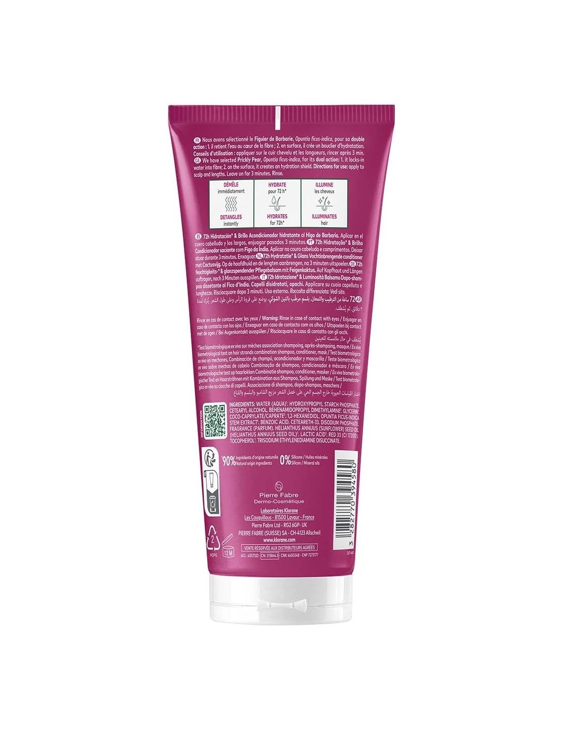 Formulado con un 90% de ingredientes de origen natural, este acondicionador enriquecido con Higo de Barbaria , que tiene propiedades hidratantes superiores a las de la glicerina gracias a sus moléculas hidro fijadoras, es eficaz para hidratar y restaurar la flexibilidad, desde el cuero cabelludo hasta las puntas.