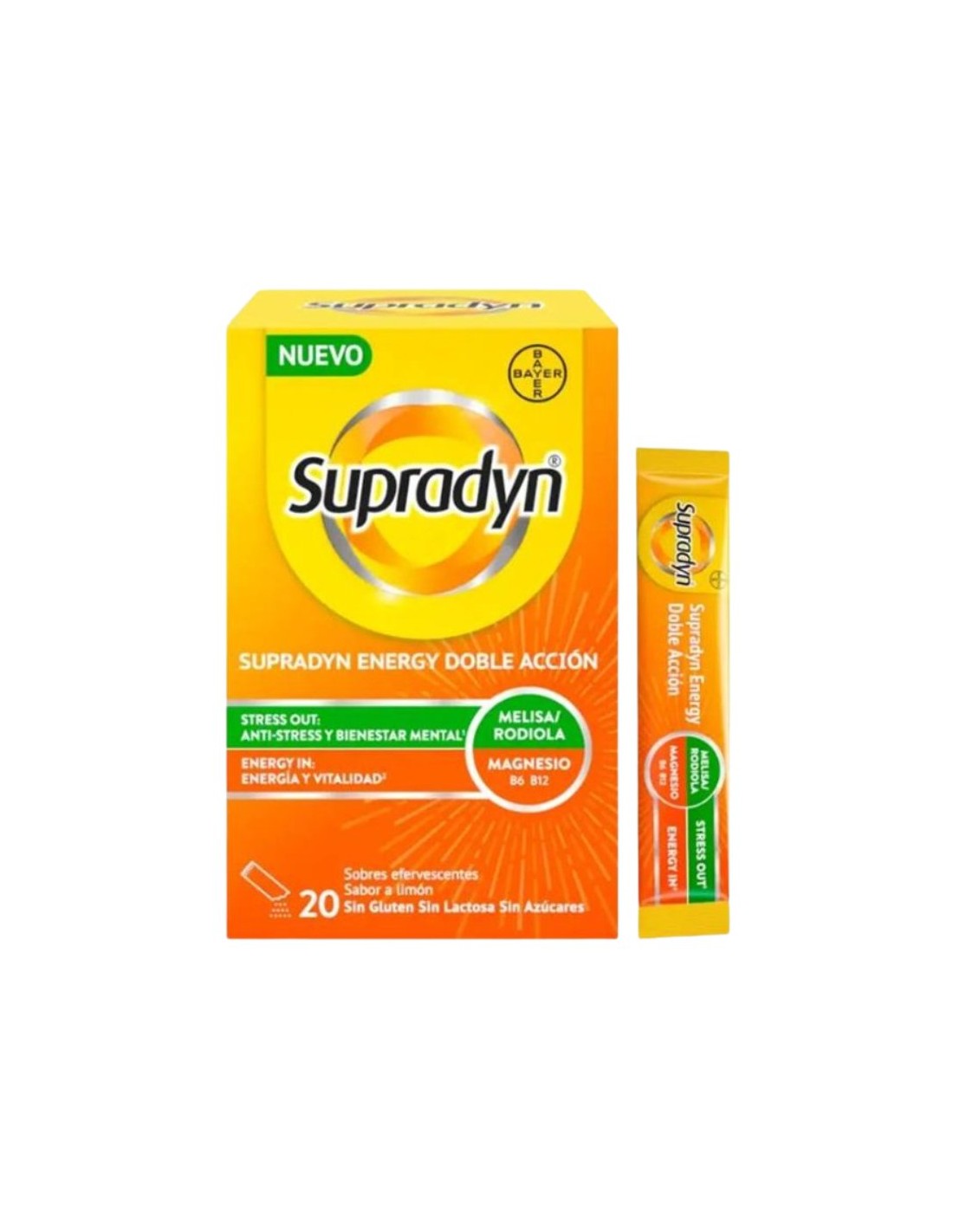 Supradyn Energy Doble Acción 20 sobres efervescentes está indicado para ofrecer una doble acción contra el estrés y la fatiga. Para aquellos que deseen recuperar su vitalidad y mantener un equilibrio mental en su día a día. A partir de 18 años.