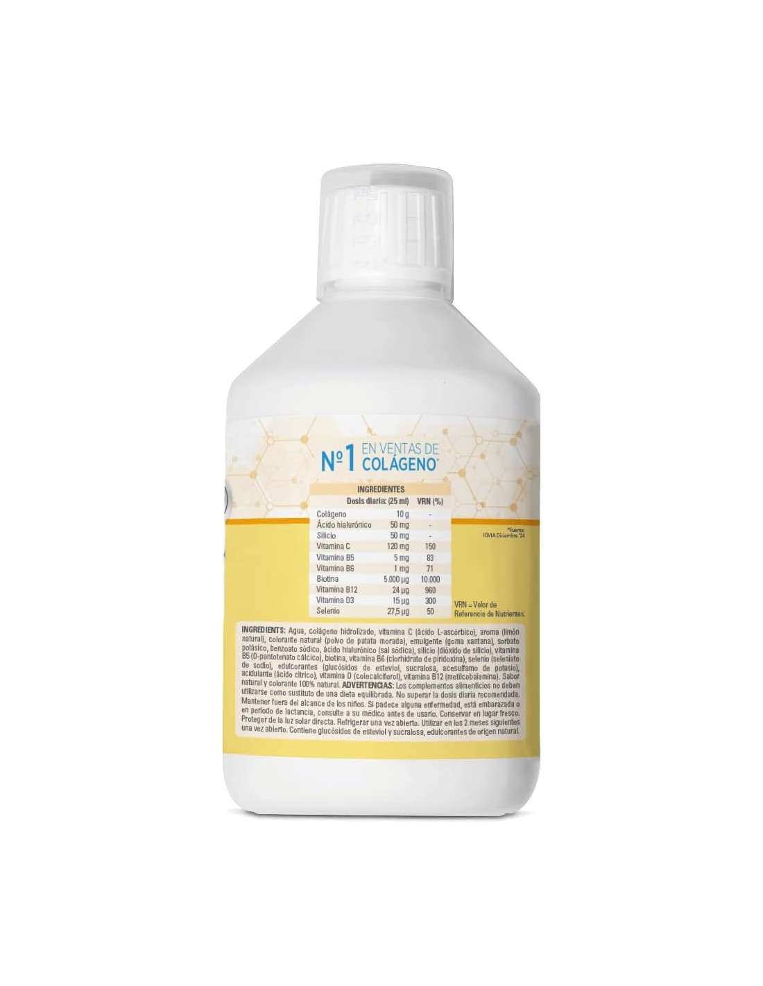 Ingredientes: Agua, colágeno hidrolizado, vitamina C (ácido L-ascórbico), aroma (limón natural), colorante natural (polvo de patata morada), emulgente (goma xantana), sorbato potásico, benzoato sódico, ácido hialurónico (sal sódica), silicio (dióxido de silicio), vitamina B5 (D-pantotenato cálcico), biotina, vitamina B6 (clorhidrato de piridoxina), selenio (seleniato de sodio), edulcorantes (glucósido de esteviol, sucralosa, acesulfamo de potasio), acidulante (ácido cítrico), vitamina D (colecalciferol), vitamina B12 (metilcobalamina). Sabor y colorante natural.